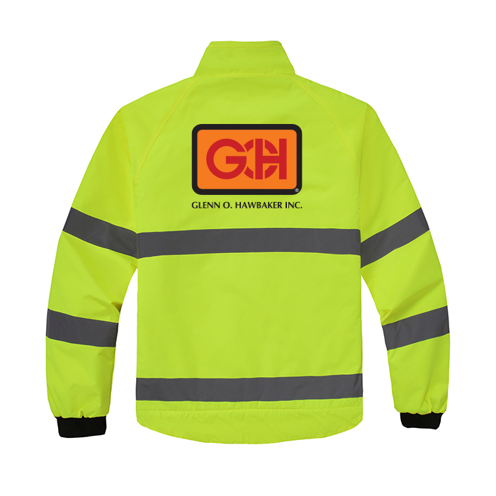 100% nylon taslan fabric outer shell with durable water repellent finish, 9-oz 100% polyester fleece fixed lining, full front zipper and full length interior storm flap, 2-inch wide reflective taping across chest and sleeves, slash zippered pockets, interior zippered pocket, rib knit cuffs and waistband.